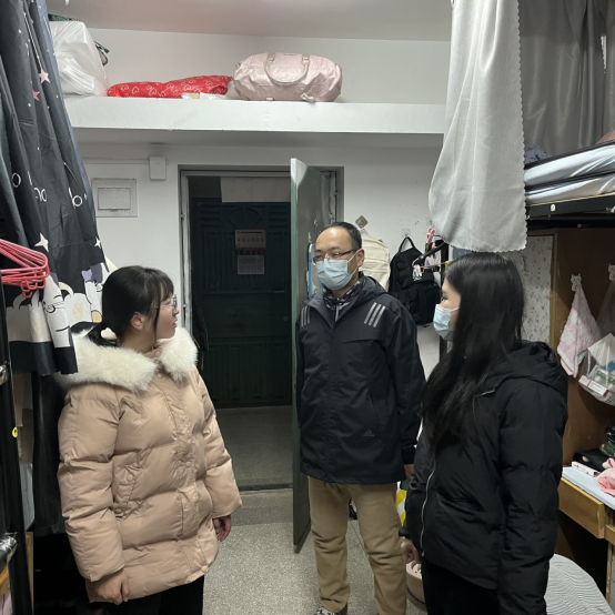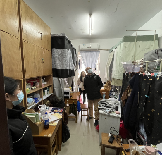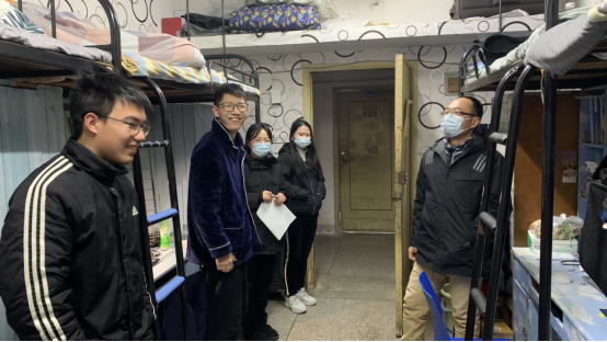 走访中,老师们走进宿舍与员工亲切交流,关切询问假期生活,详细了解员工的学习生活情况,为大家发放防疫物资,并重点强调安全、作息、纪律、文化建设等方面的注意事项。李义伟指出,目前全国疫情形势依然严峻,同学们在日常生活中要注意做好个人防护,加强宿舍内务的整理,营造一个健康、舒适、温馨的生活环境;同时希望同学们尽快调整状态,完成从假期到新学期的状态转变,更好更快地适应新学期生活,以积极饱满的精神状态投入新学期的奋斗中。在走进2022届毕业生宿舍交流时,李义伟鼓励同学们积极面对每次就业机会,把握机遇、直面挑战,为自己丰富多彩的老员工活画上一个完美的句号。
